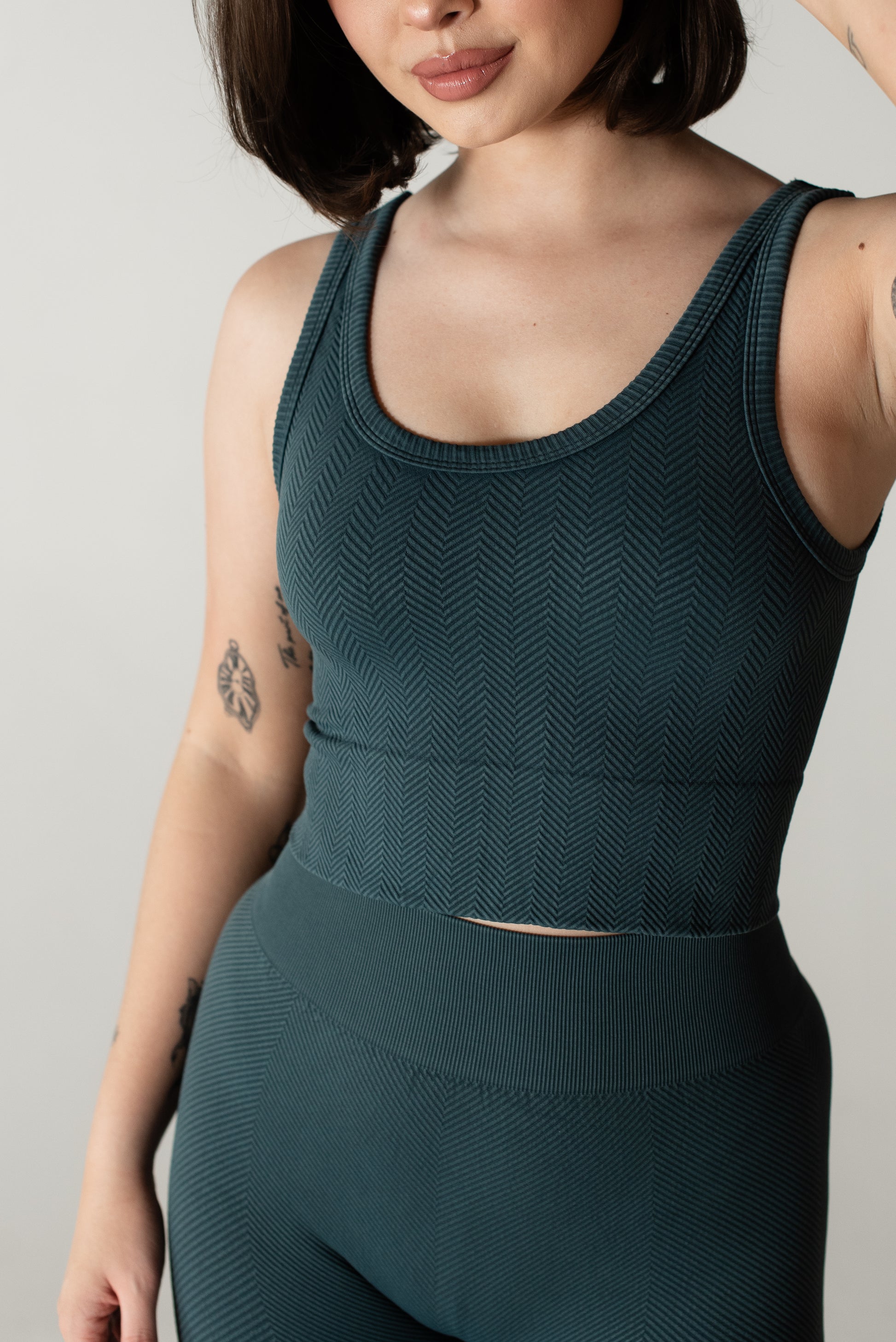 Hello Carmen top, the seamless, two-in-one essential you didn’t know you needed. With a reversible design, you can wear it as a high round neck or a flattering V-neck, because options are everything. Made with breathable, sweat-wicking fabric, this top keeps you cool and comfortable no matter what your day holds. The herringbone design isn’t just for style, it’s built for support. Whether you have a smaller or fuller chest, you’ll feel secure enough to go braless while still getting the lift and hold you need. The added compression makes it perfect for high-impact workouts while giving you’re a sculpted, flattering fit.