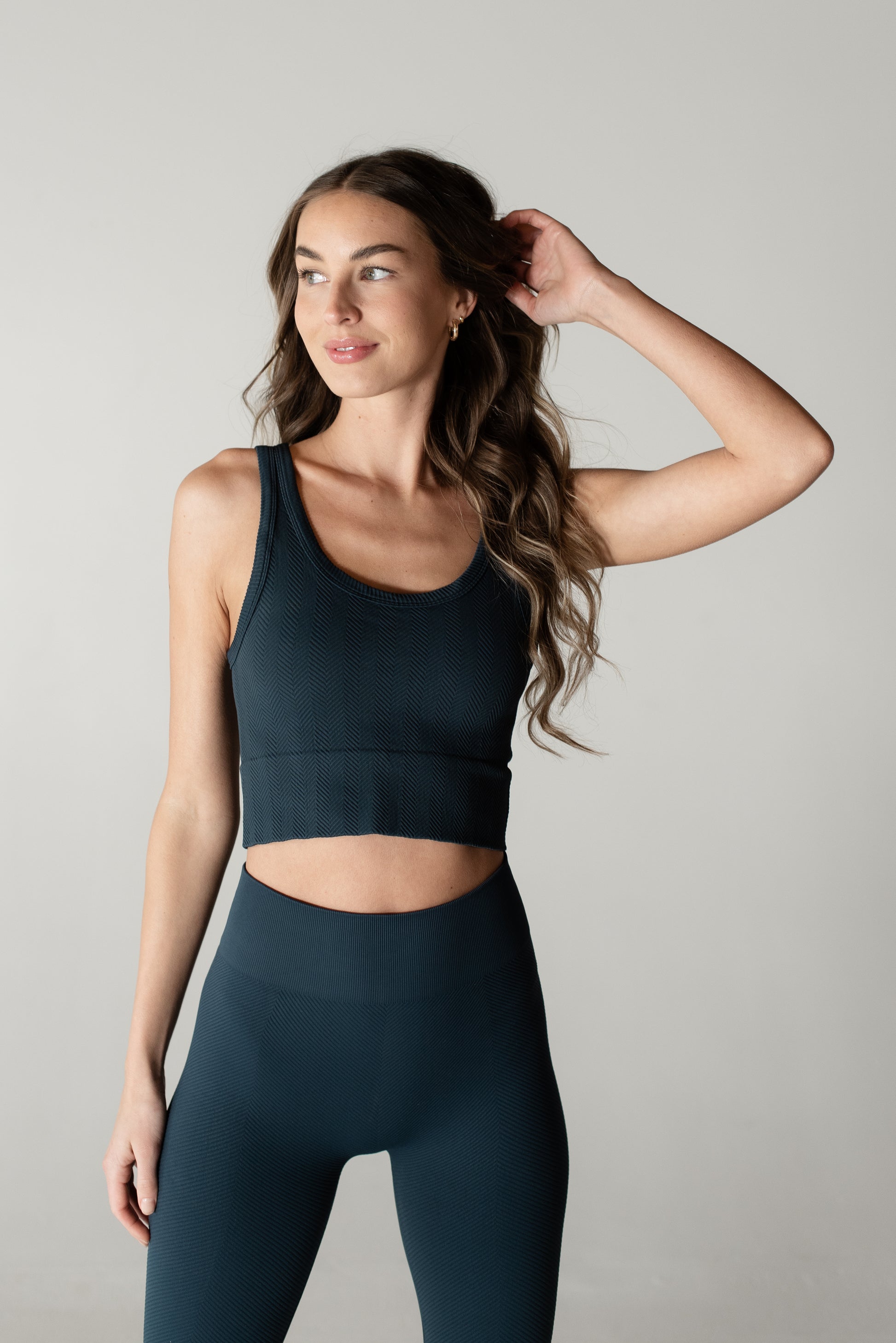Hello Carmen top, the seamless, two-in-one essential you didn’t know you needed. With a reversible design, you can wear it as a high round neck or a flattering V-neck, because options are everything. Made with breathable, sweat-wicking fabric, this top keeps you cool and comfortable no matter what your day holds. The herringbone design isn’t just for style, it’s built for support. Whether you have a smaller or fuller chest, you’ll feel secure enough to go braless while still getting the lift and hold you need. The added compression makes it perfect for high-impact workouts while giving you’re a sculpted, flattering fit.