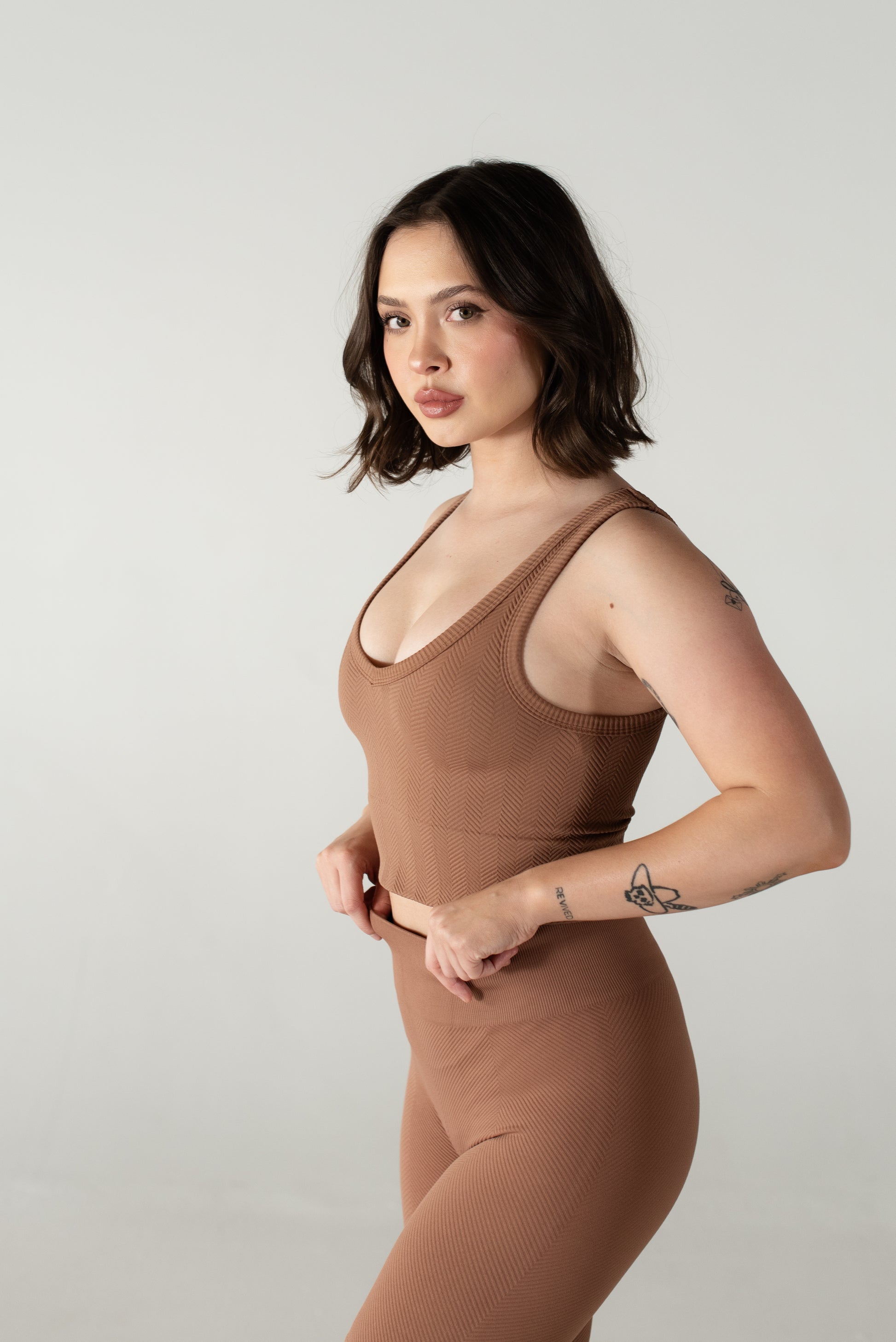 Hello Carmen top, the seamless, two-in-one essential you didn’t know you needed. With a reversible design, you can wear it as a high round neck or a flattering V-neck, because options are everything. Made with breathable, sweat-wicking fabric, this top keeps you cool and comfortable no matter what your day holds. The herringbone design isn’t just for style, it’s built for support. Whether you have a smaller or fuller chest, you’ll feel secure enough to go braless while still getting the lift and hold you need. The added compression makes it perfect for high-impact workouts while giving you’re a sculpted, flattering fit.