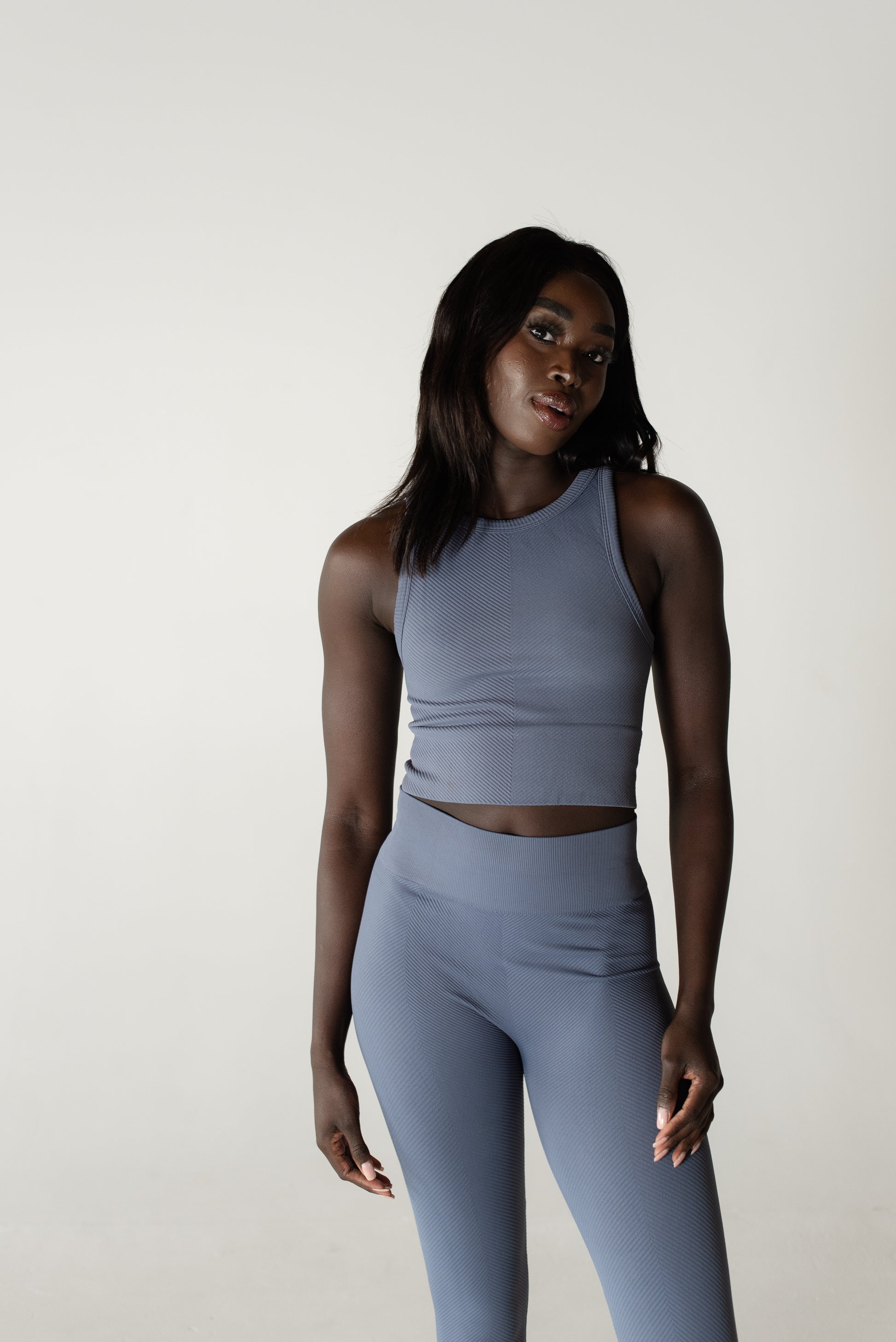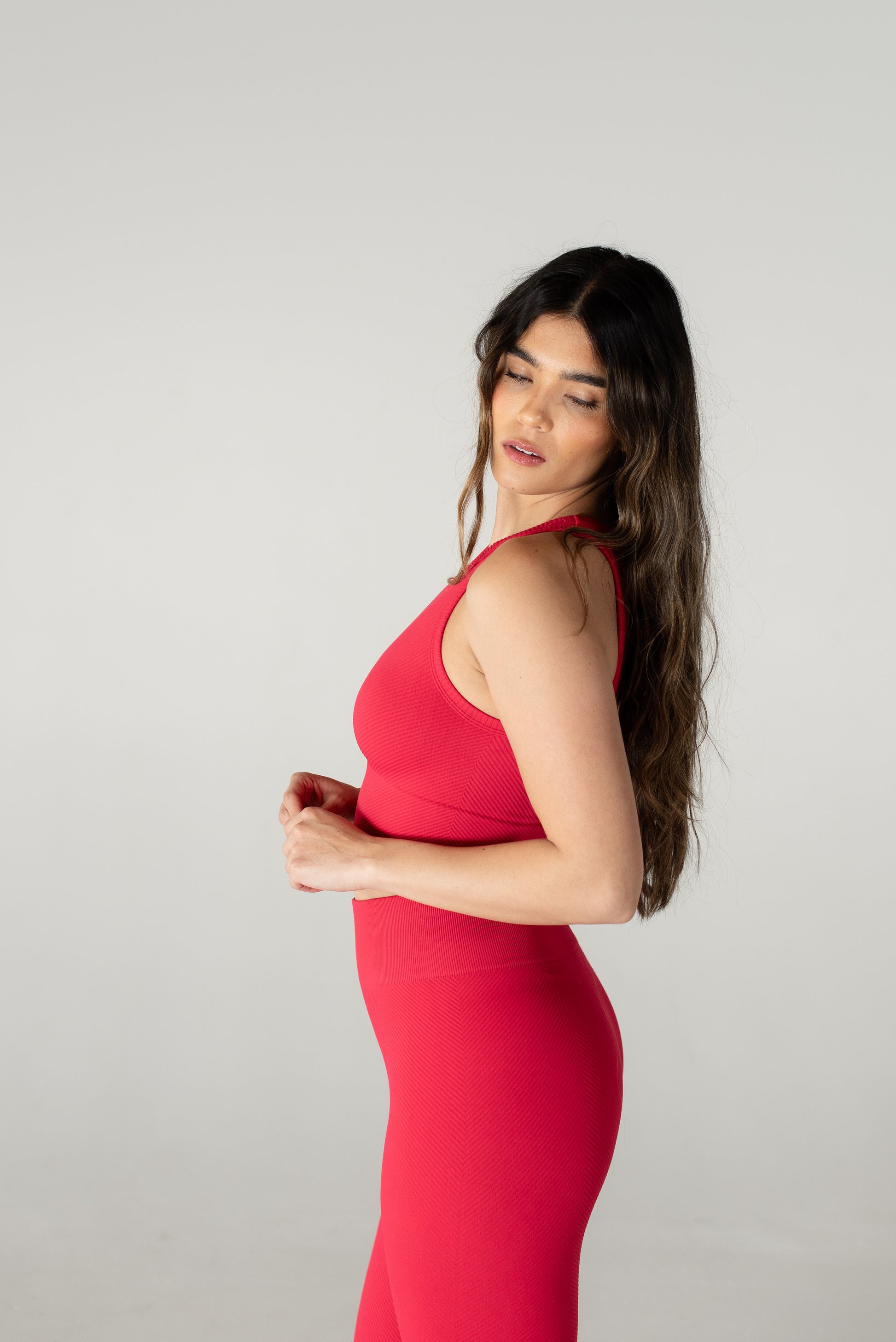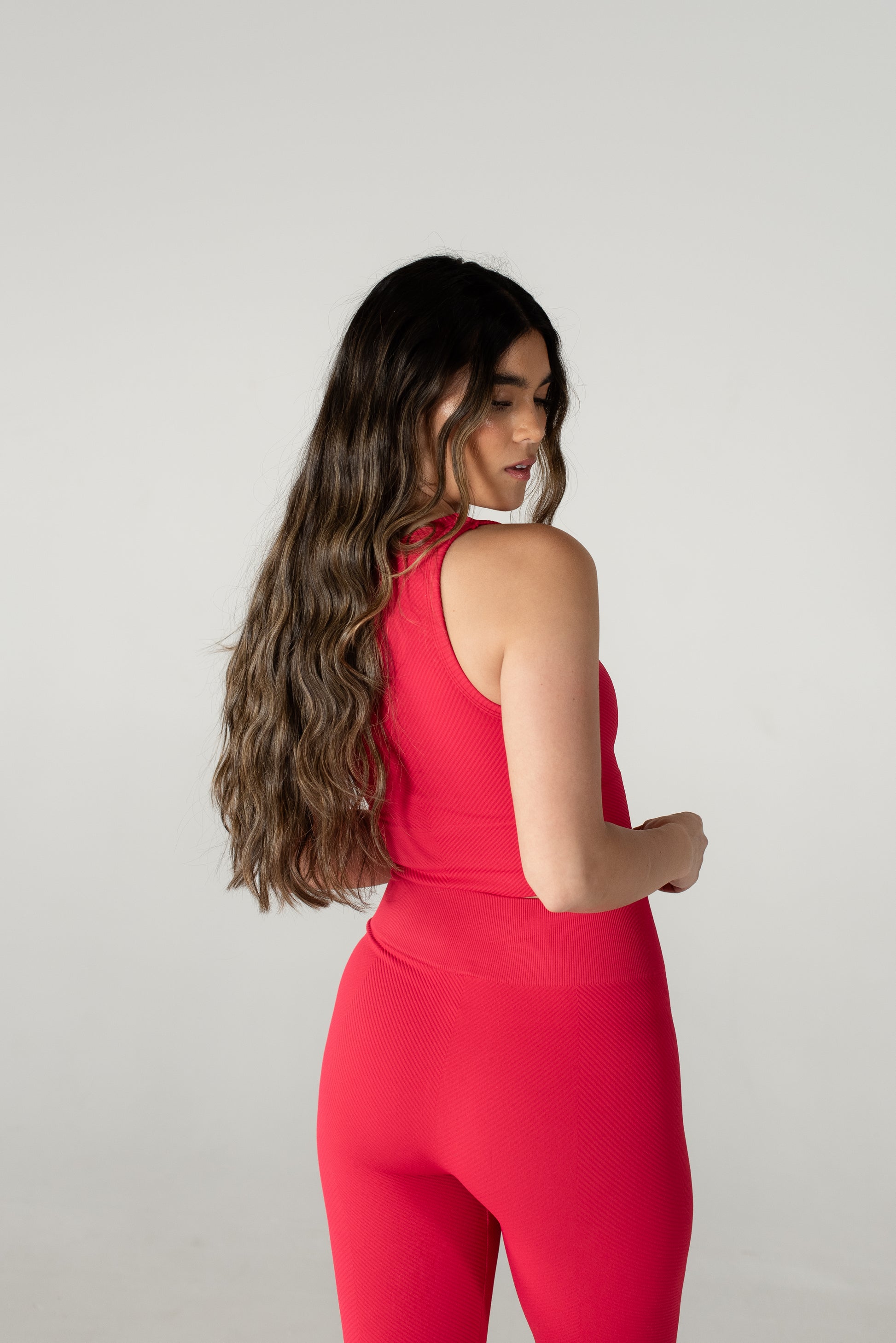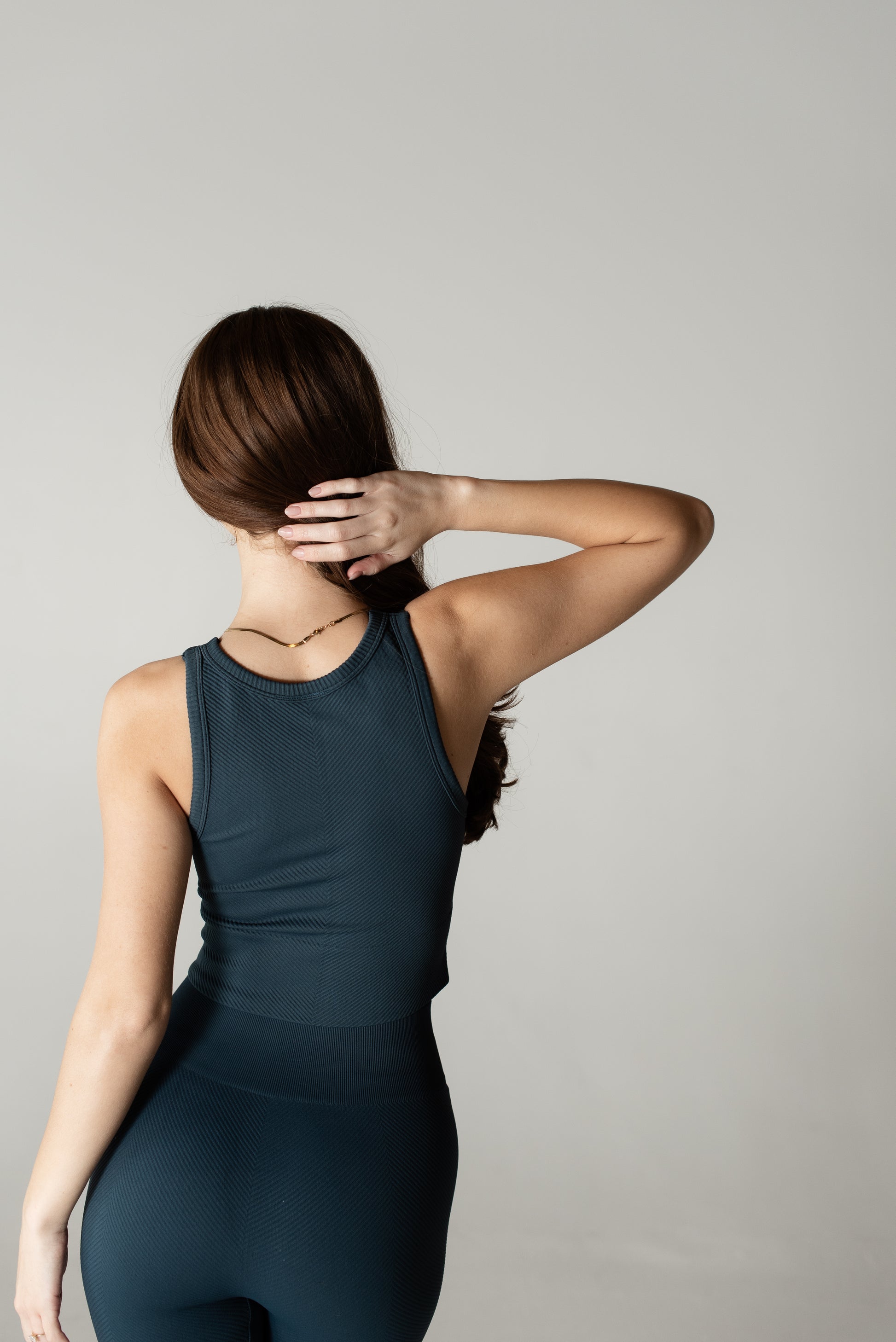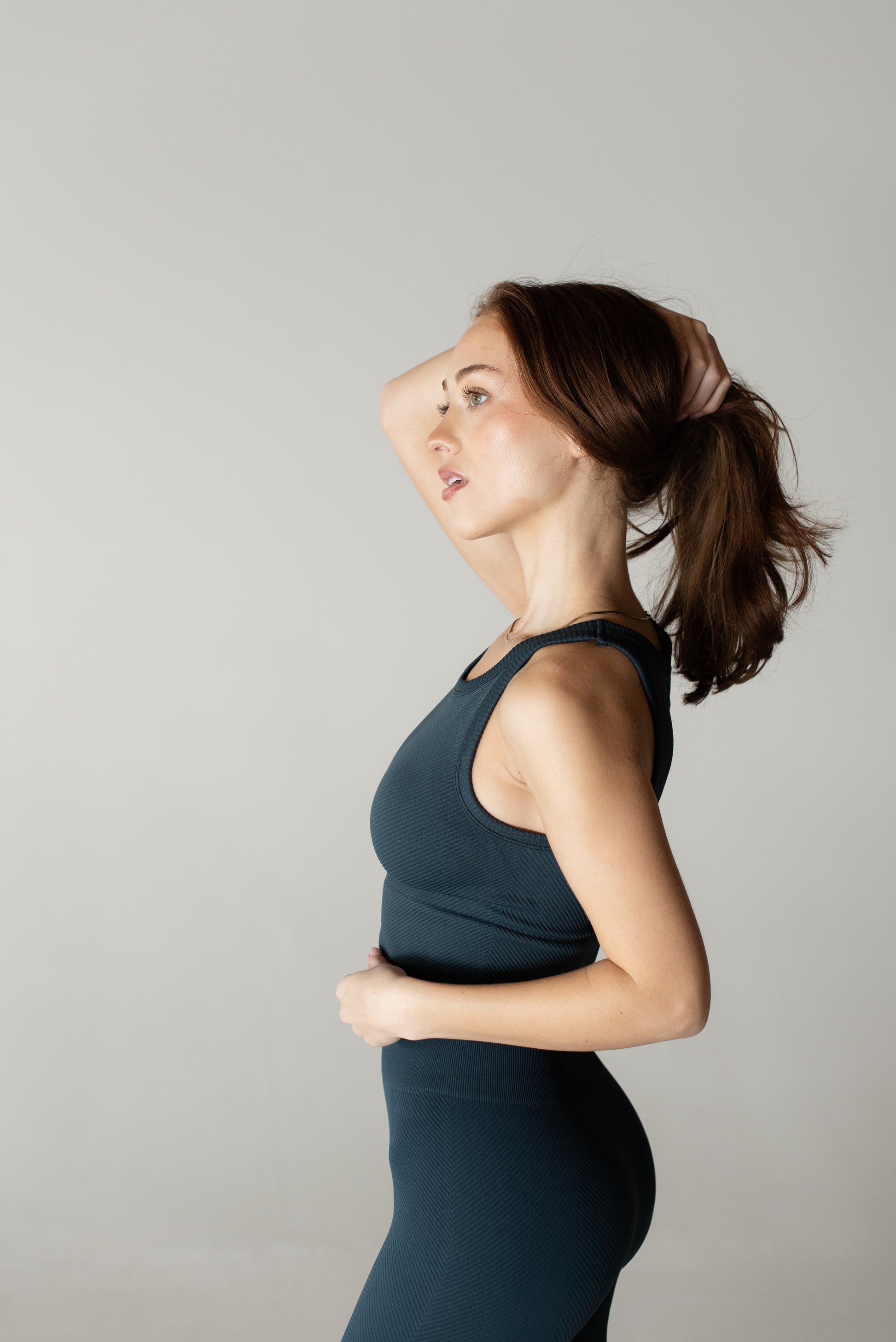 Meet your new favorite workout top, the Skye top. Designed with a sleek high neck and stylish chevron pattern, it’s perfect for anyone who loves a little extra coverage without sacrificing style. The seamless design makes it super soft, breathable, and sweat-wicking, so you stay cool and comfortable no matter how sweaty you are. But here’s the best park, the chevron design adds compression, giving you extra support and a sculpted fit that holds you in all the right places. No need for a bra (yes, really) and it smooths back bulges for a sleek, flattering look. Plus the 3” waistband keeps everything in place so you don’t have to deal with annoying roll-ups. Pair it with any of our seamless bottoms for a matching set that’s as functional as it is fashionable.