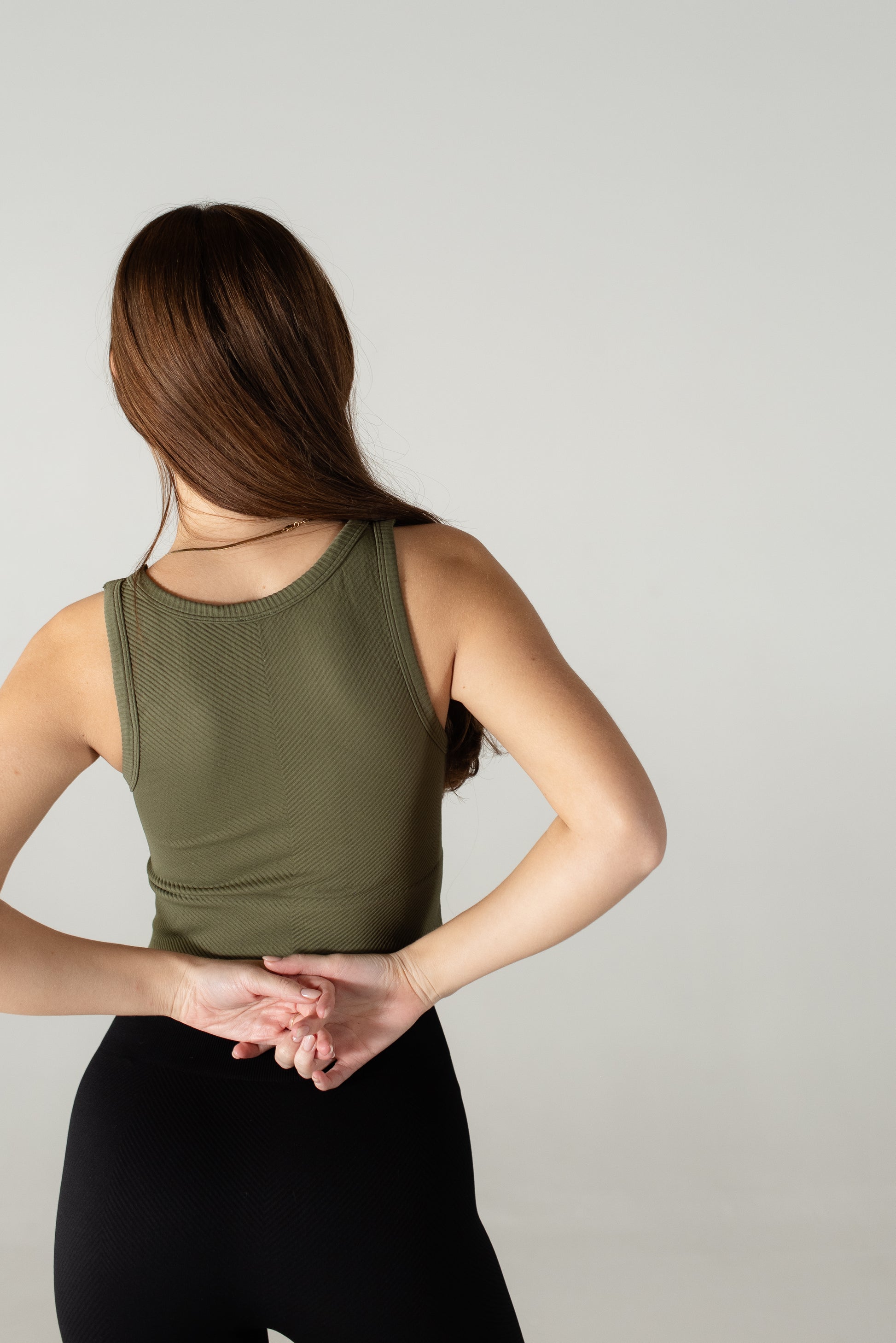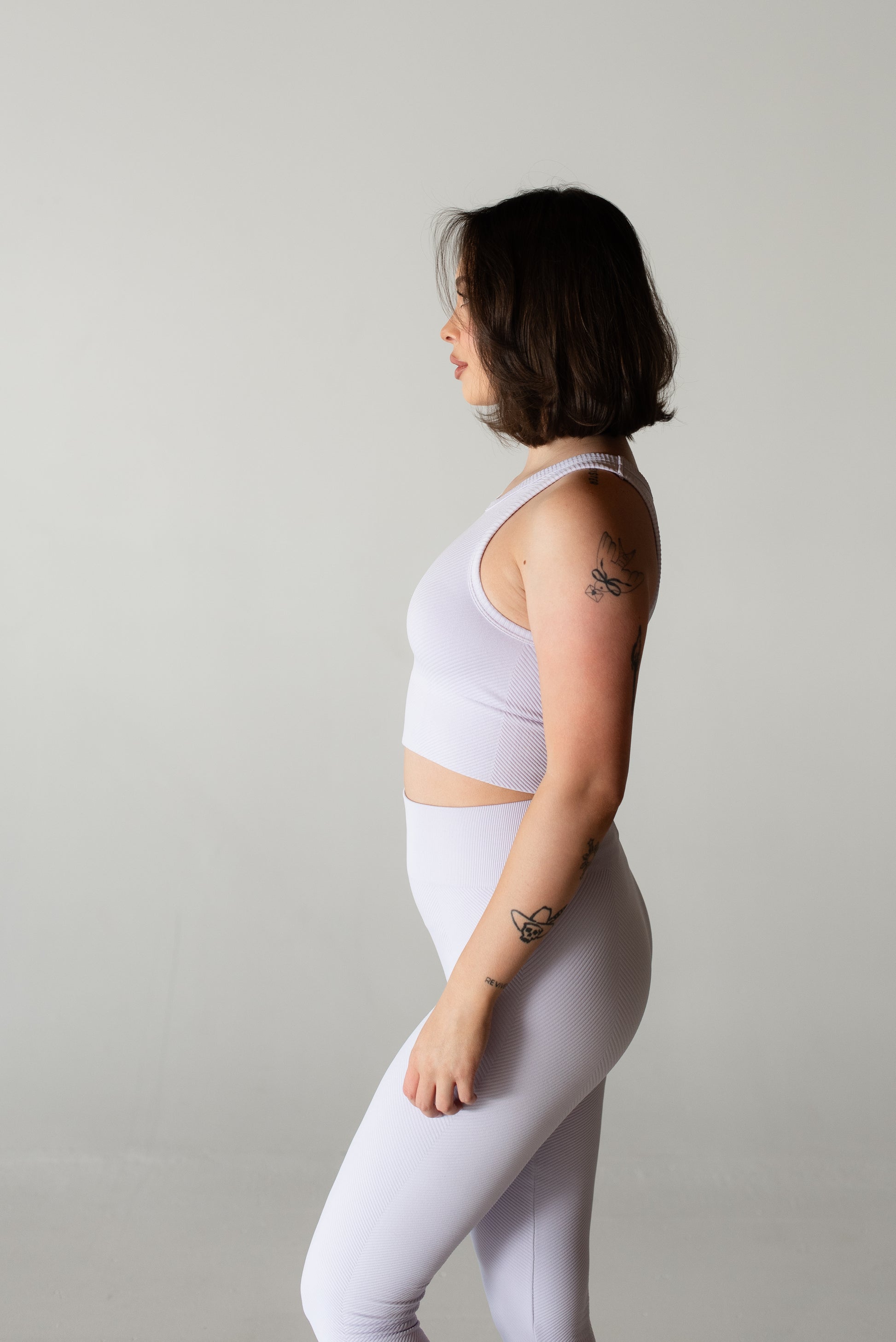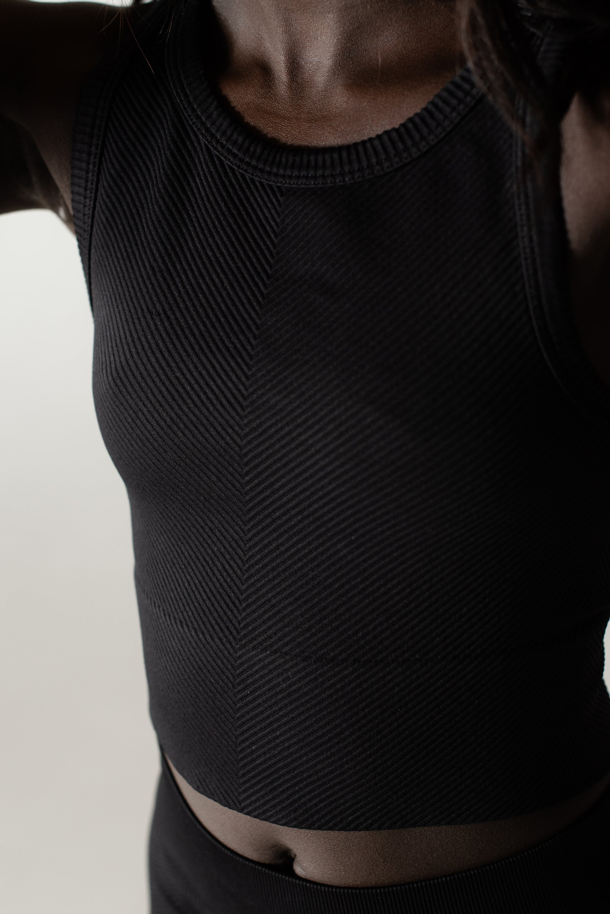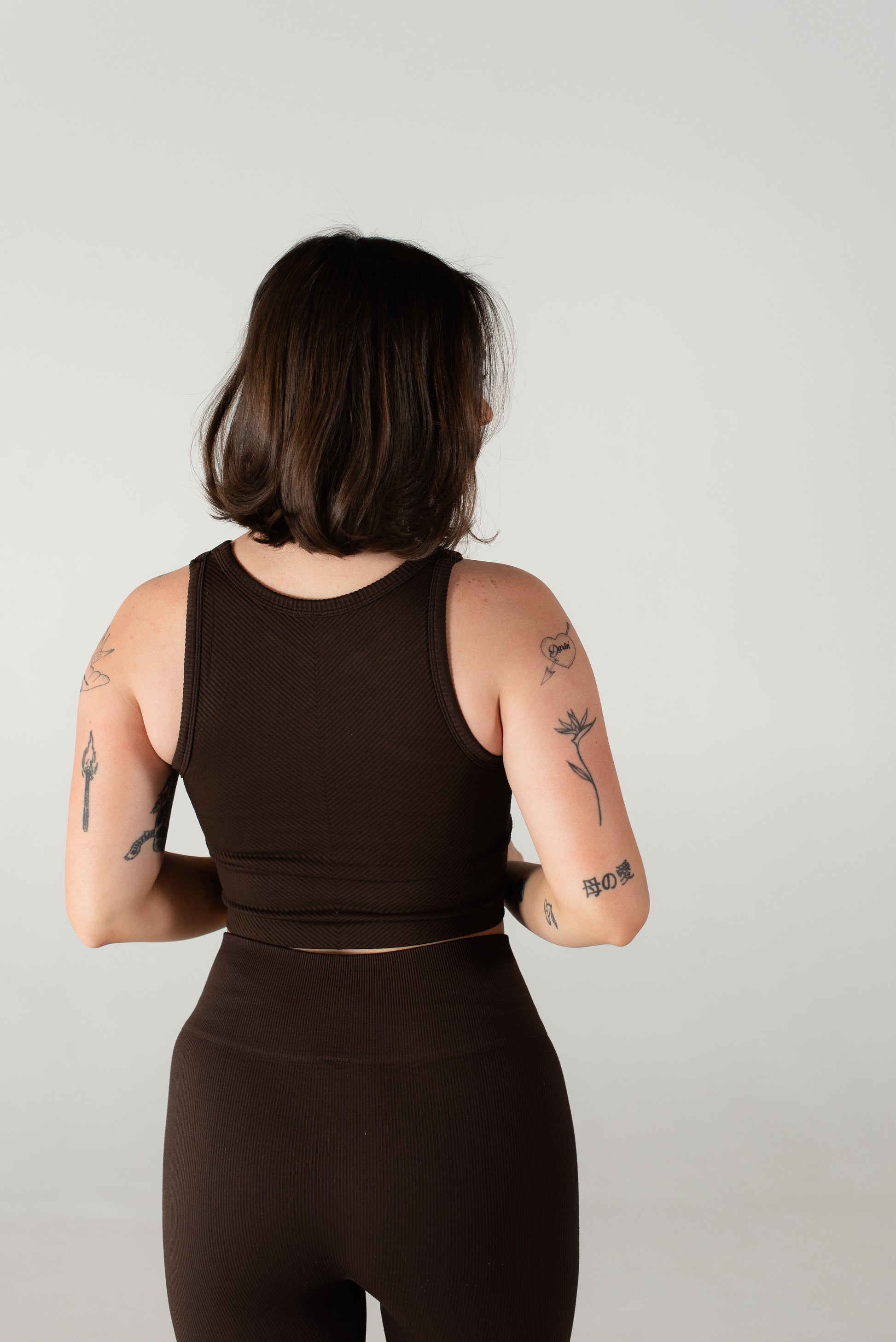 Meet your new favorite workout top, the Skye top. Designed with a sleek high neck and stylish chevron pattern, it’s perfect for anyone who loves a little extra coverage without sacrificing style. The seamless design makes it super soft, breathable, and sweat-wicking, so you stay cool and comfortable no matter how sweaty you are. But here’s the best park, the chevron design adds compression, giving you extra support and a sculpted fit that holds you in all the right places. No need for a bra (yes, really) and it smooths back bulges for a sleek, flattering look. Plus the 3” waistband keeps everything in place so you don’t have to deal with annoying roll-ups. Pair it with any of our seamless bottoms for a matching set that’s as functional as it is fashionable.