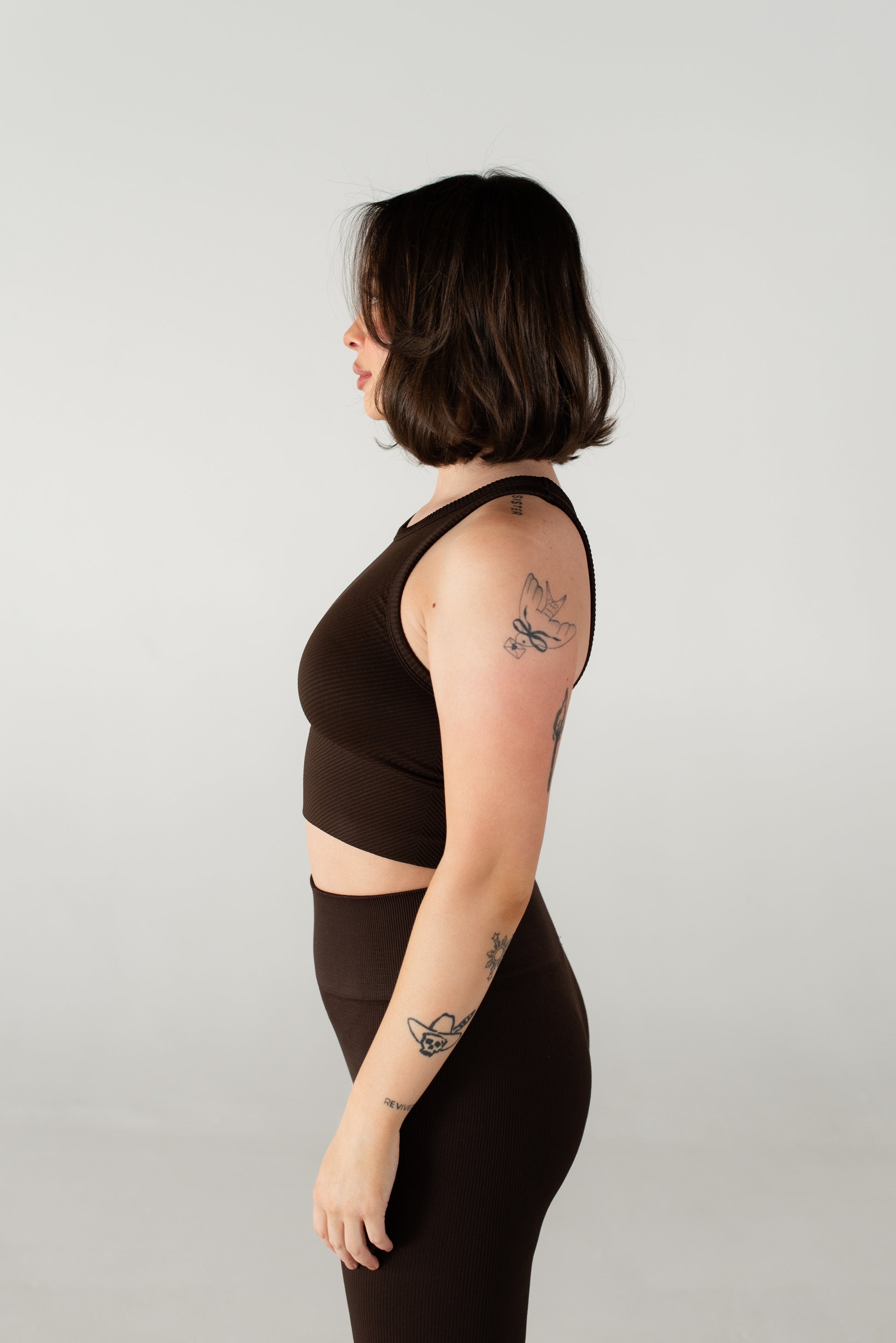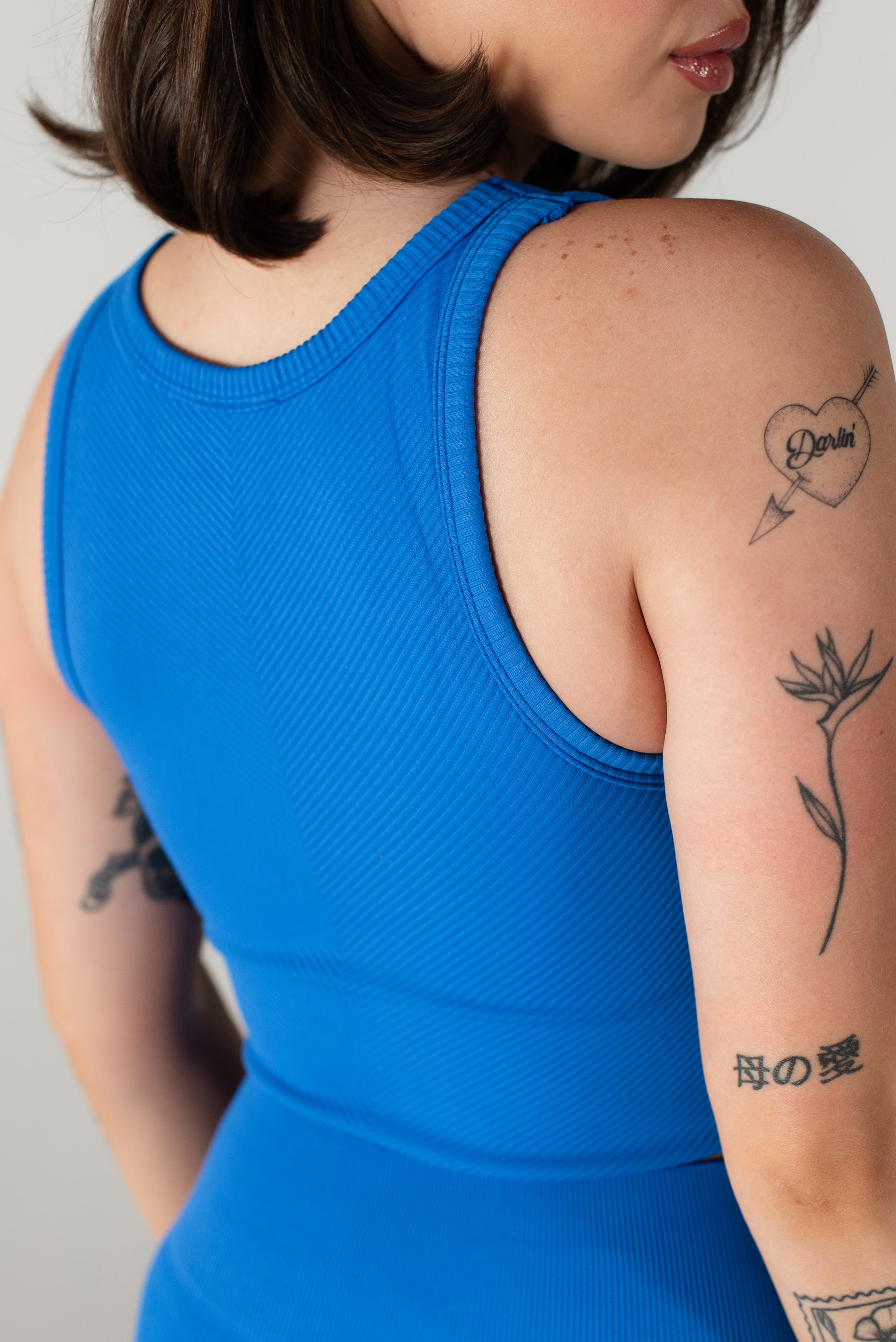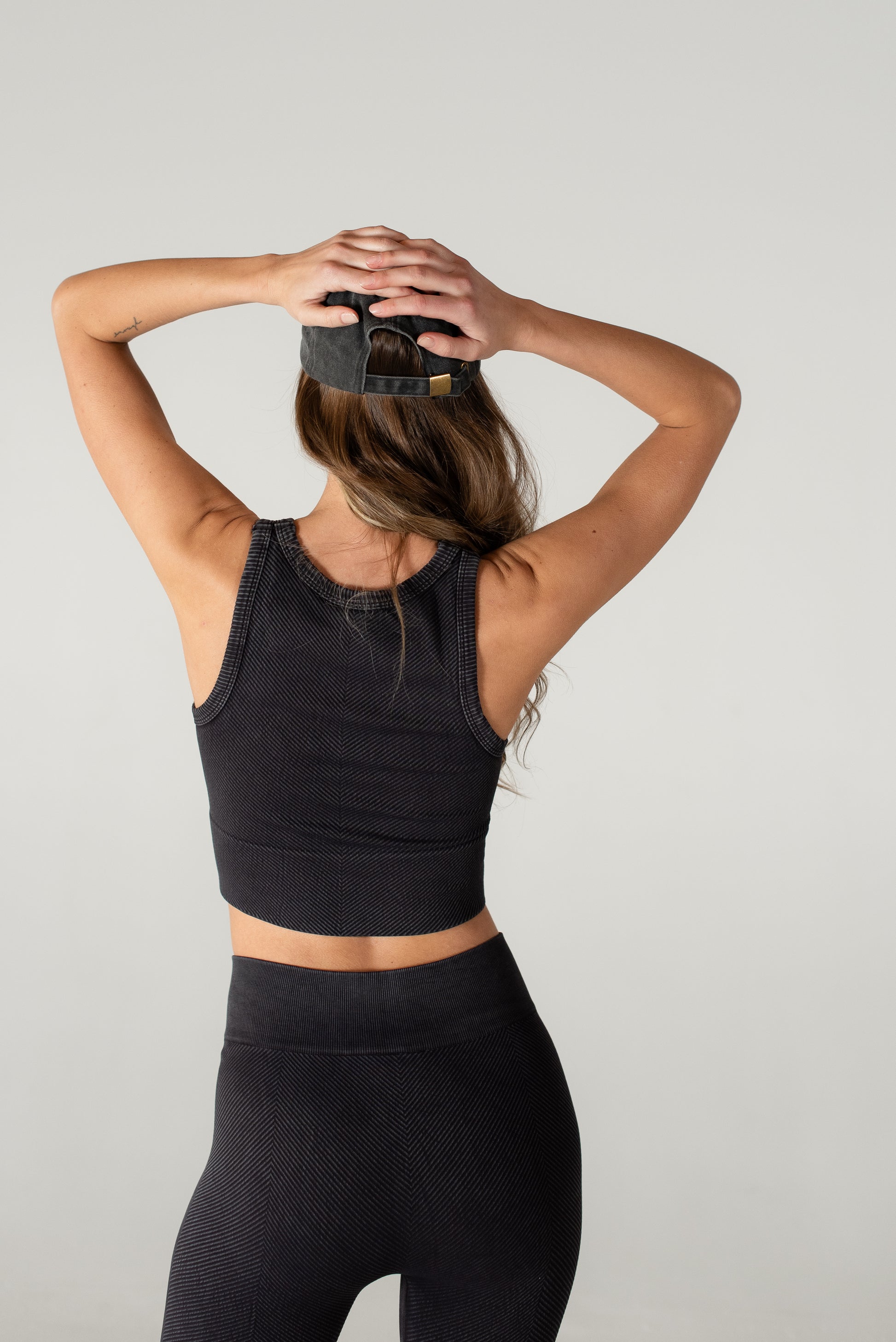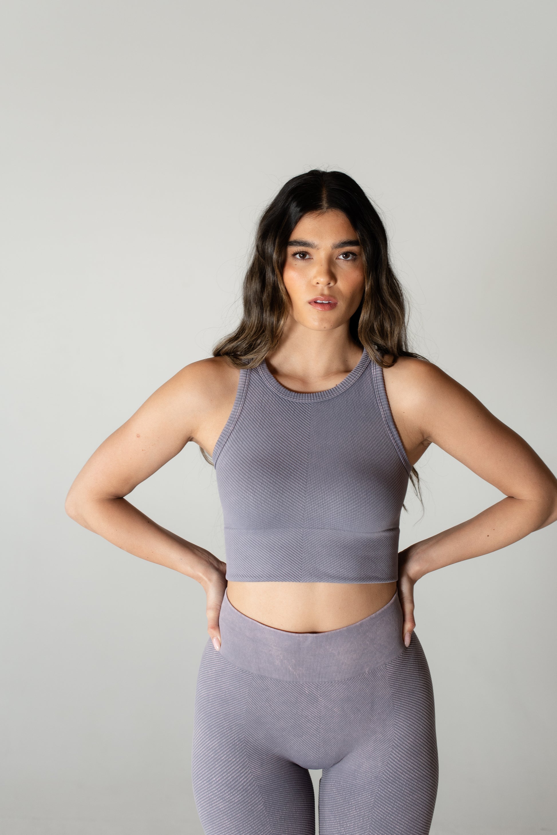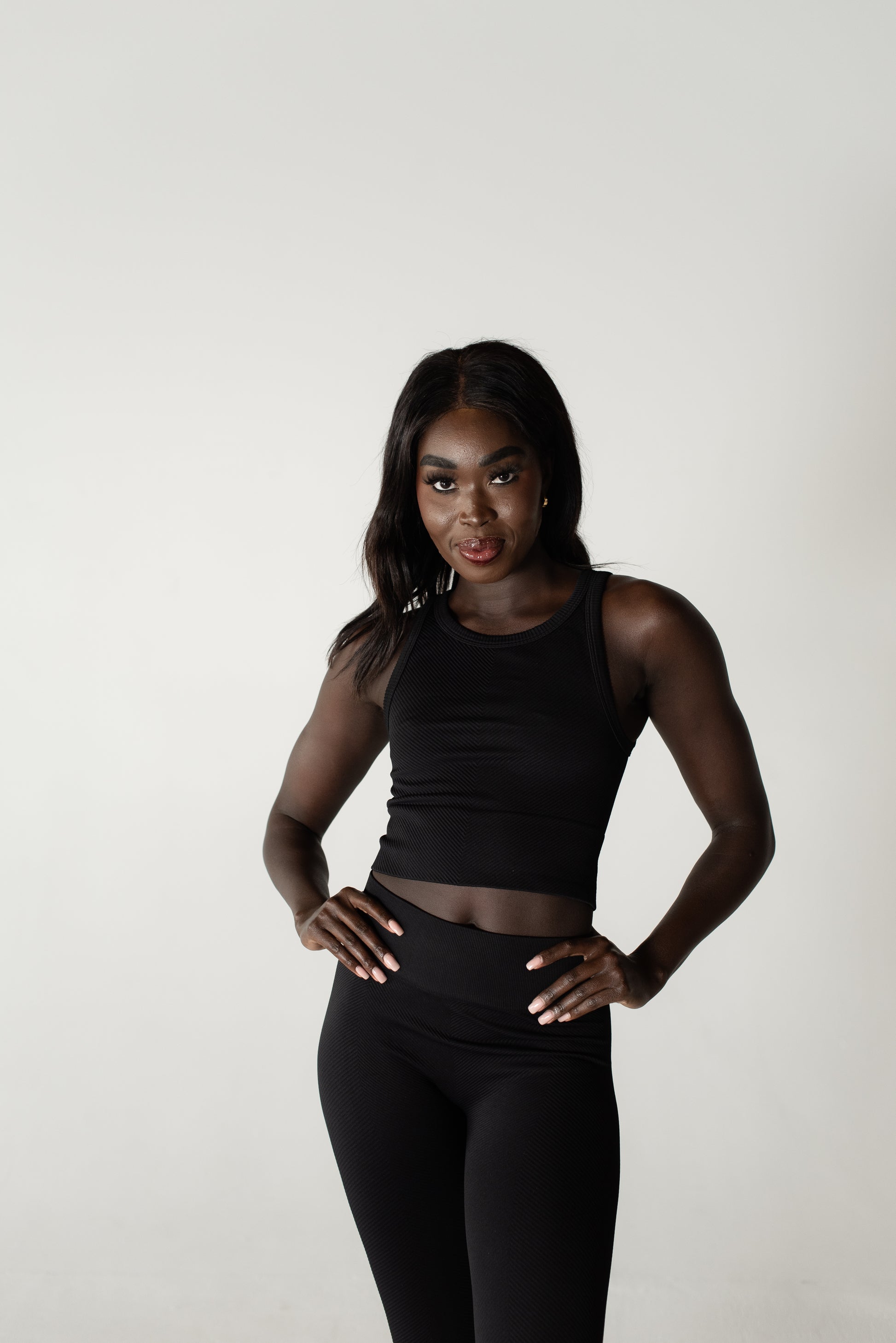 Meet your new favorite workout top, the Skye top. Designed with a sleek high neck and stylish chevron pattern, it’s perfect for anyone who loves a little extra coverage without sacrificing style. The seamless design makes it super soft, breathable, and sweat-wicking, so you stay cool and comfortable no matter how sweaty you are. But here’s the best park, the chevron design adds compression, giving you extra support and a sculpted fit that holds you in all the right places. No need for a bra (yes, really) and it smooths back bulges for a sleek, flattering look. Plus the 3” waistband keeps everything in place so you don’t have to deal with annoying roll-ups. Pair it with any of our seamless bottoms for a matching set that’s as functional as it is fashionable.